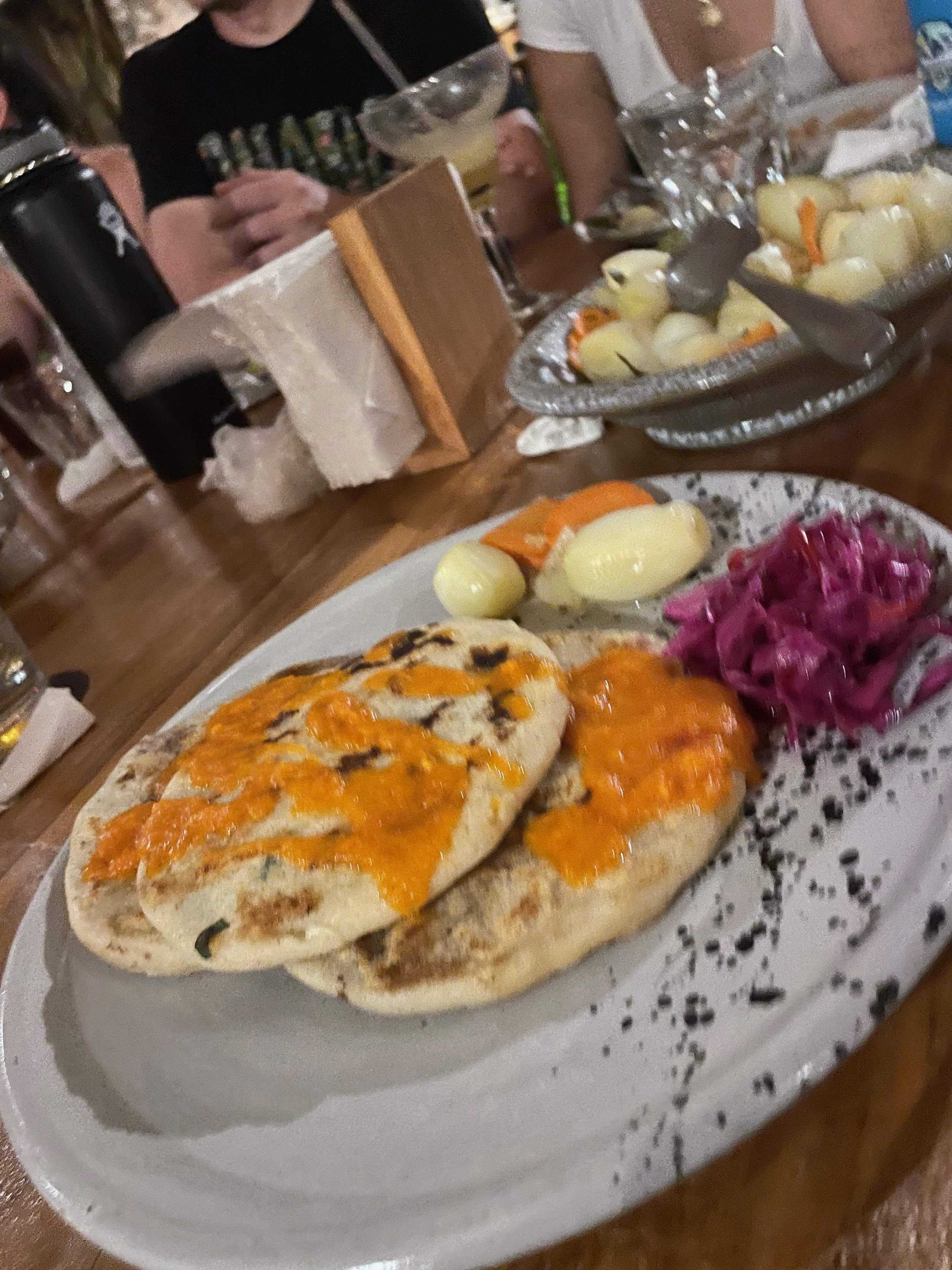 Each night, we gather together for dinner. Sometimes we’ll go to a nearby hostel like we did for Taco Tuesday, but usually it’s in the hotel dining room. There’s a full menu of items from typical El Salvadorean dishes to good old American cheeseburgers. Here is the traditional dish they made us for pupusa night: